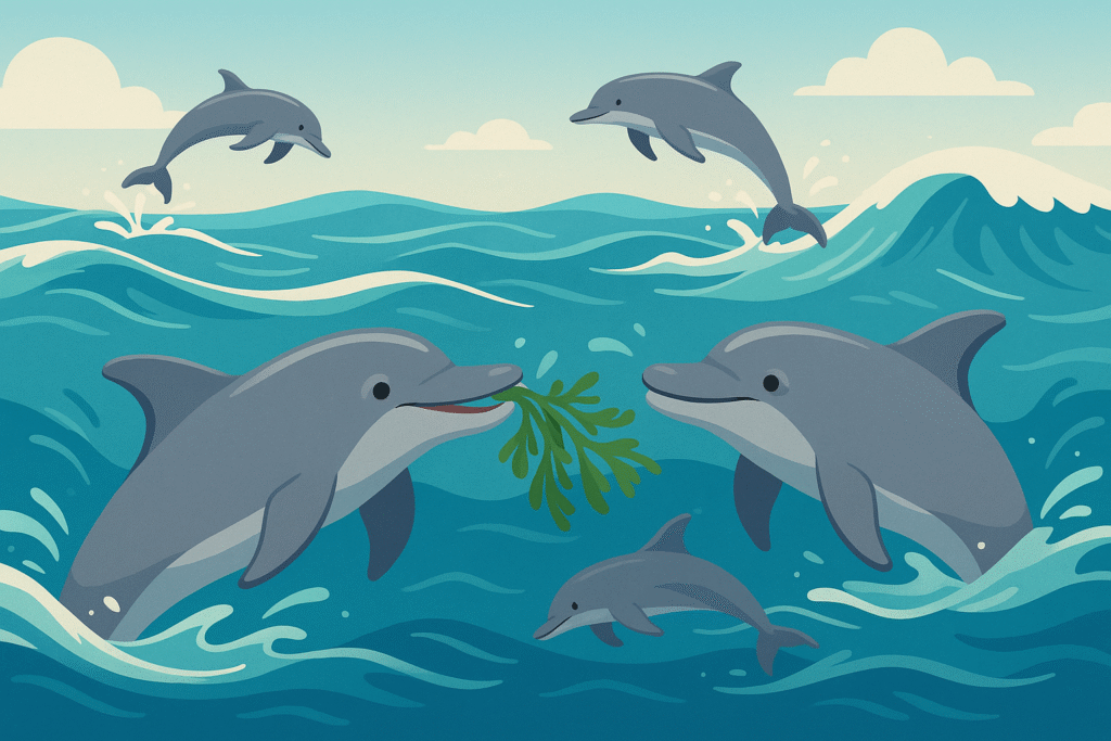 Un esempio divertente è il “passaggio dell’alga”: un delfino raccoglie un ciuffo d’alga e lo lancia verso un compagno, che lo riprende e lo rimanda indietro. Non serve a nutrirsi, non serve a difendersi: è puro divertimento. Alcuni ricercatori hanno paragonato questo comportamento a una partita di palla avvelenata in versione marina.