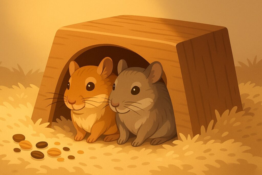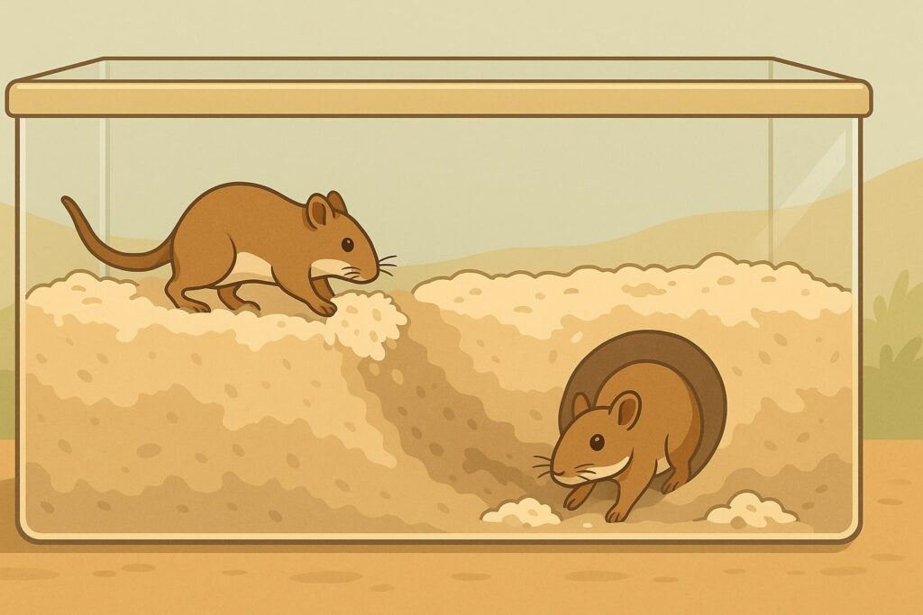 La lettiera, poi, è il cuore dell’habitat. Senza uno strato spesso e soffice, i gerbilli non possono realizzare i tunnel che tanto amano. La profondità ideale è di almeno 20-25 cm, abbastanza da permettere scavi complessi e stabili. I materiali migliori sono quelli naturali e sicuri: trucioli di carta, canapa o fibra di cellulosa. Questi substrati trattengono bene gli odori, sono facili da pulire e soprattutto non creano problemi respiratori. Evita invece il legno di pino o cedro, perché possono rilasciare sostanze nocive. Una buona lettiera non è solo un “pavimento”, ma il materiale da costruzione con cui i tuoi gerbilli daranno vita al loro mondo sotterraneo.