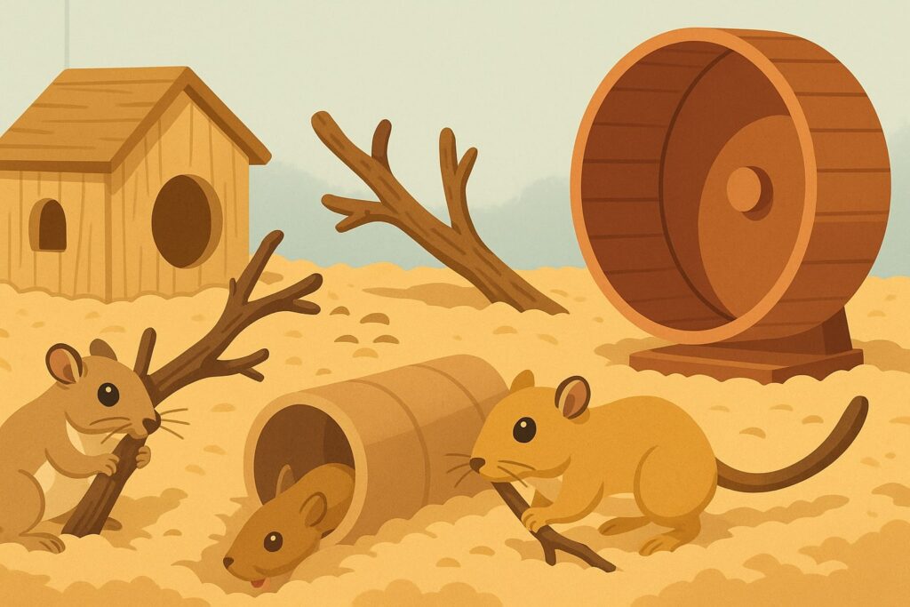 Per rendere l’ambiente ancora più stimolante, puoi aggiungere oggetti semplici che hai in casa. Rotoli di carta igienica, piccole scatole di cartone o tessuti naturali non trattati diventano materiale da gioco e da costruzione. Ogni elemento nuovo attira la loro attenzione e incoraggia comportamenti diversi, dal rosicchiare al trasportare, fino a costruire piccole tane alternative. Cambiare periodicamente la disposizione degli accessori aiuta a mantenere l’habitat sempre nuovo e sorprendente.