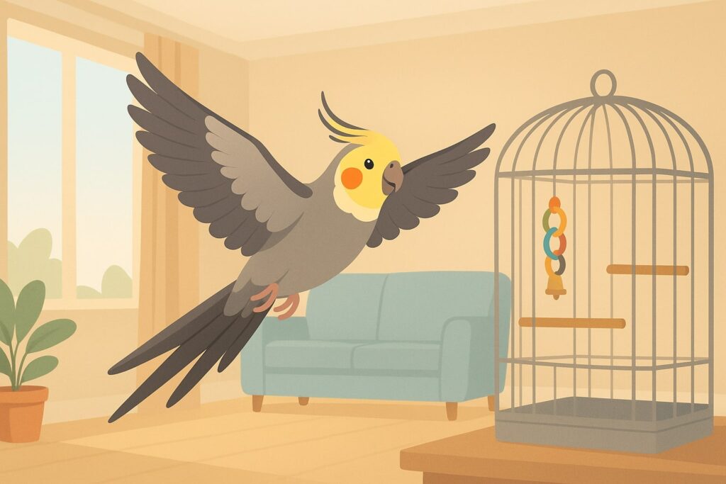 Molti temono che lasciandola libera troppo spesso la calopsite perda l’abitudine alla gabbia, ma in realtà accade il contrario. Se l’uscita è parte della routine, il ritorno diventa naturale, perché la gabbia rimane il suo punto sicuro, il luogo del cibo e del riposo. È importante, però, che la gabbia stessa sia confortevole e non vissuta come una punizione: deve contenere giochi, posatoi e spazi adeguati.